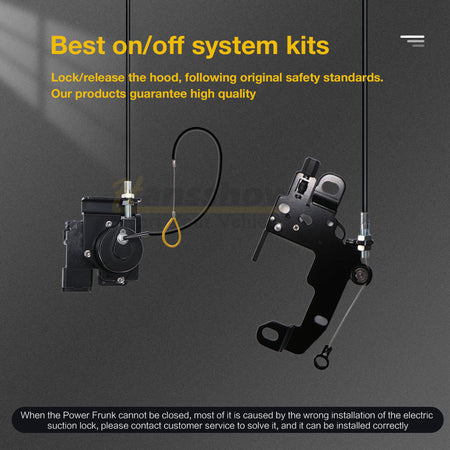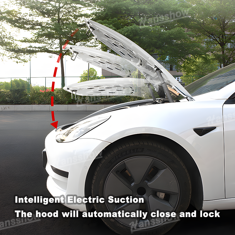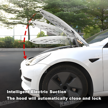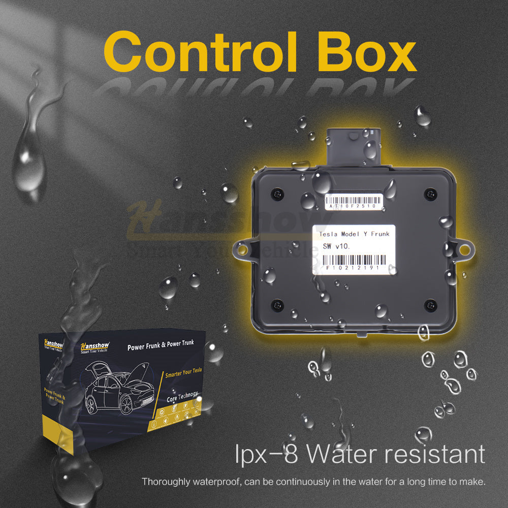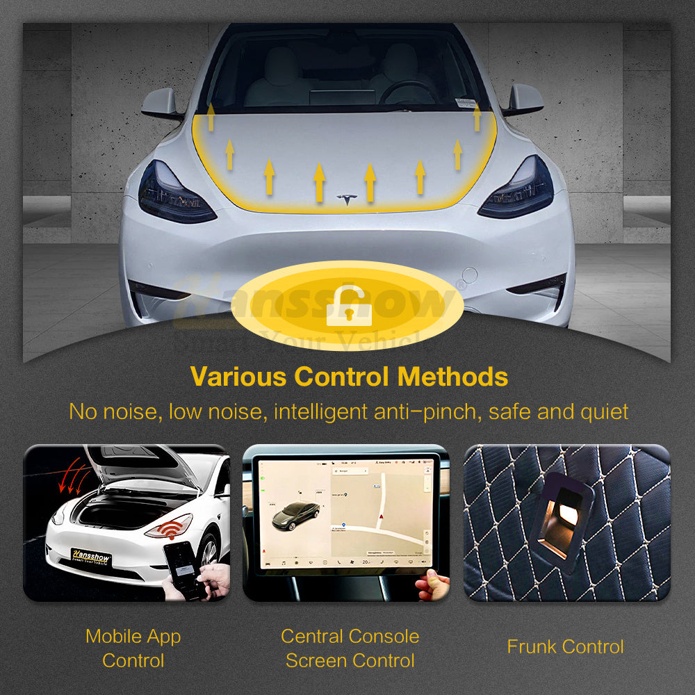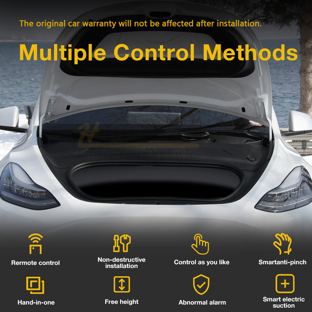 3. Power Frunk V5 Feature: 1) Superfine strut 2) Ultra low noise strut and electric suction lock 3) Waterproof control box and electric lock 4) Aviation-grade waterproof plug 5) Specially designed bracket for durability improvement and non-destructive installation 6) Intelligent control system prevents the Frunk from opening while driving 4. 1 year warranty