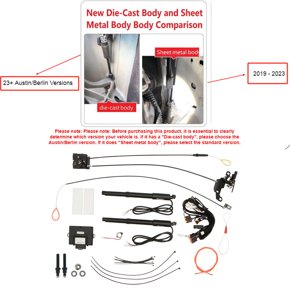 Before making any purchases or inquiries, please ensure you are aware of whether your Model Y is the Austin or Berlin version. If it has a "Die-cast body", please choose the 2023+ Austin/Berlin version. If it does "Sheet metal body", please select the standard version. If you encounter difficulties in identifying your version, feel free to reach out to our technical support team for assistance.