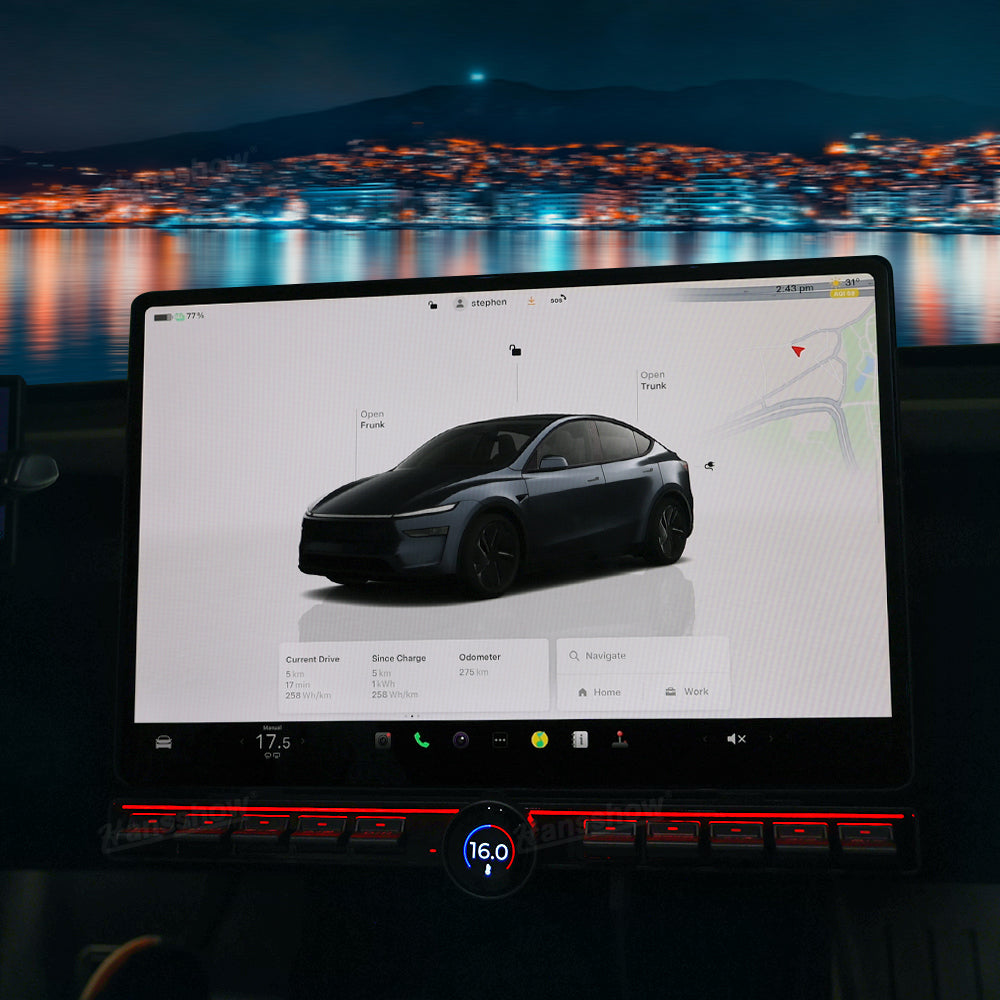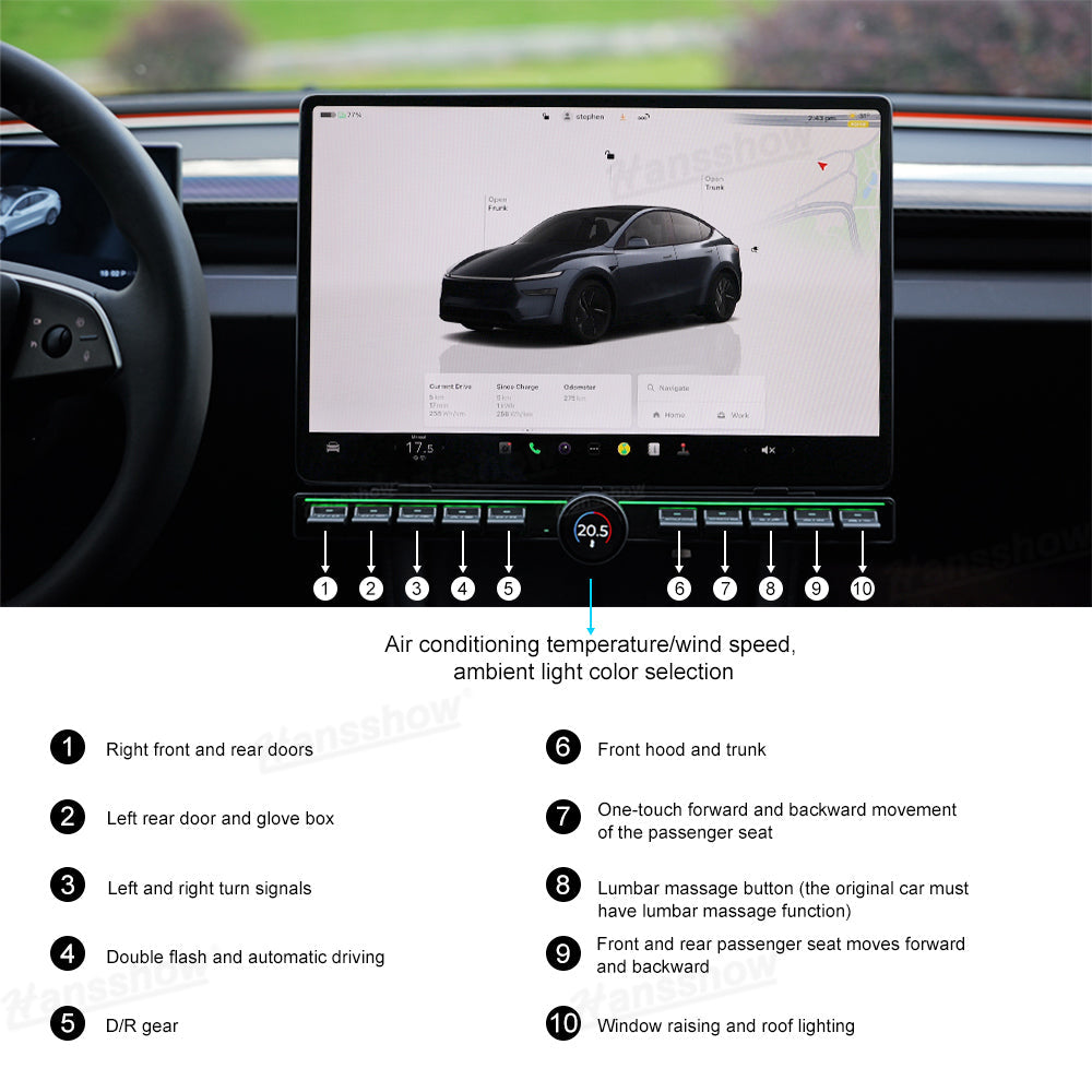 • Multifunctional design: 10 physical buttons plus a knob allow you to complete them at your fingertips.  This can achieve simple one-touch operations, including Adjusting air conditioning temperature/wind speed, ambient light color selection, etc, offering unparalleled convenience within your Tesla.