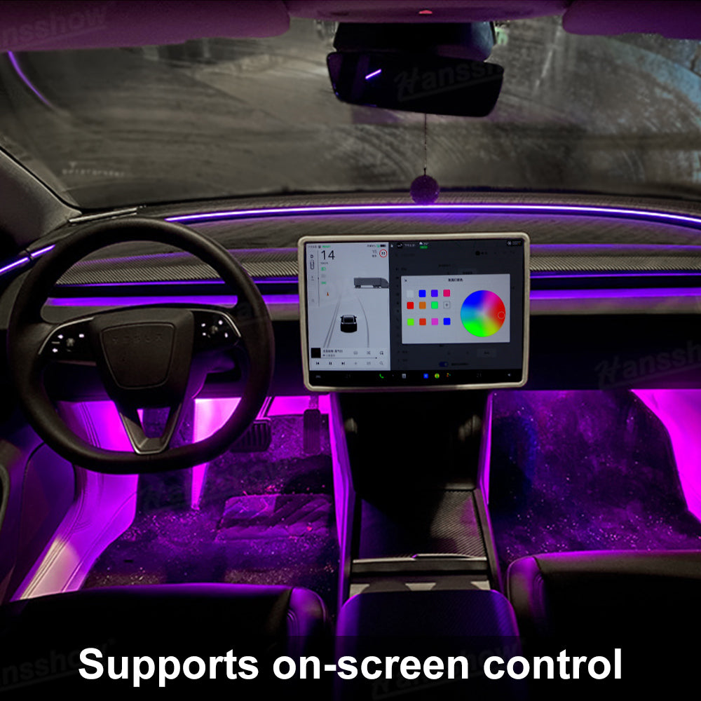 Immersive 128-Color Dynamic Lighting: Experience vibrant, flowing light effects with 128 color options. Customize your cabin’s mood effortlessly via your Tesla’s factory screen with Hansshow precision.