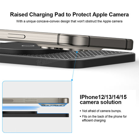 Camera-Safe Charging: The upgraded phone wireless charger features a raised central coil design, effectively preventing obstruction of the phone's camera and ensuring the lens is not pressed or damaged during use. The coil position is precisely calculated for magnetic alignment, providing more stable and efficient charging.