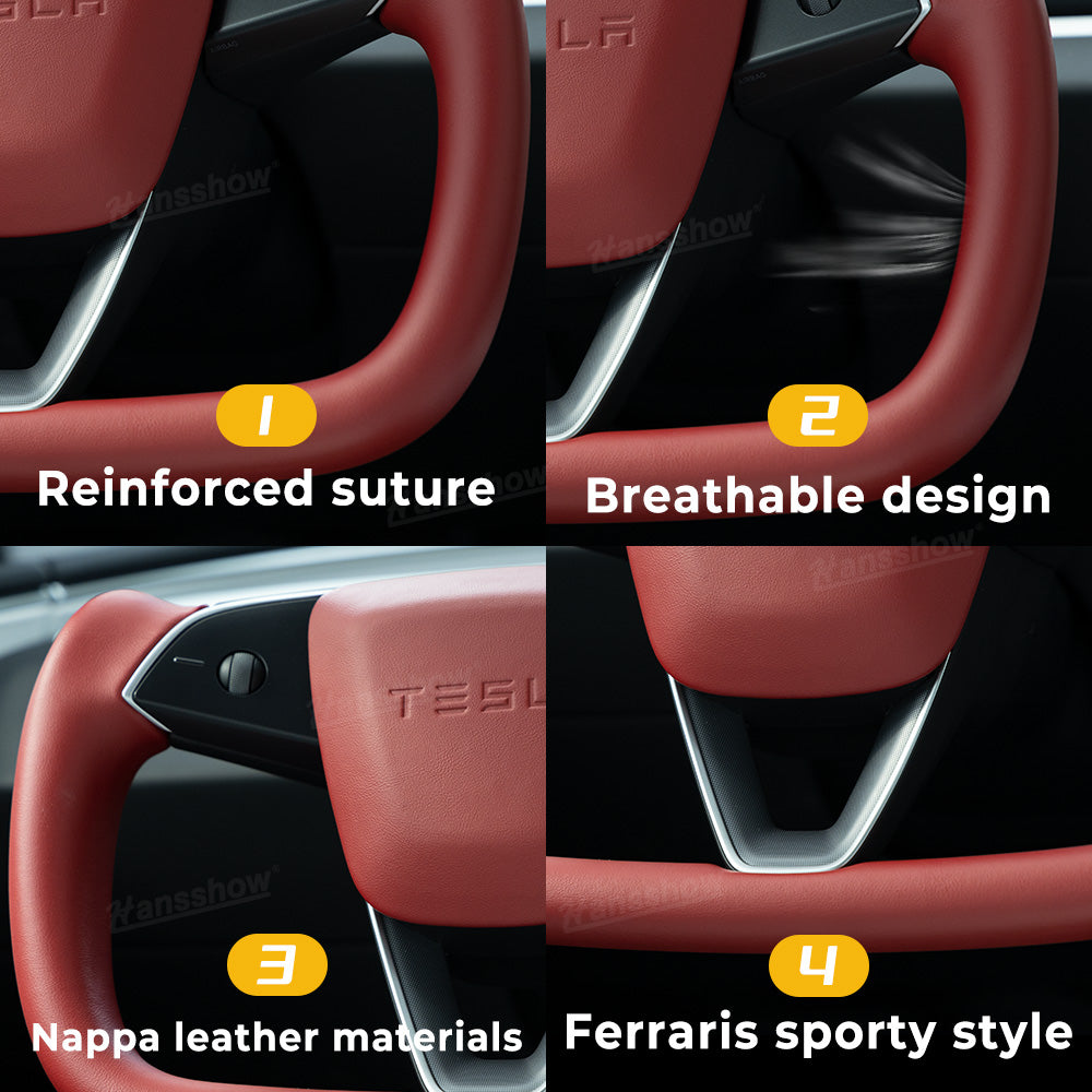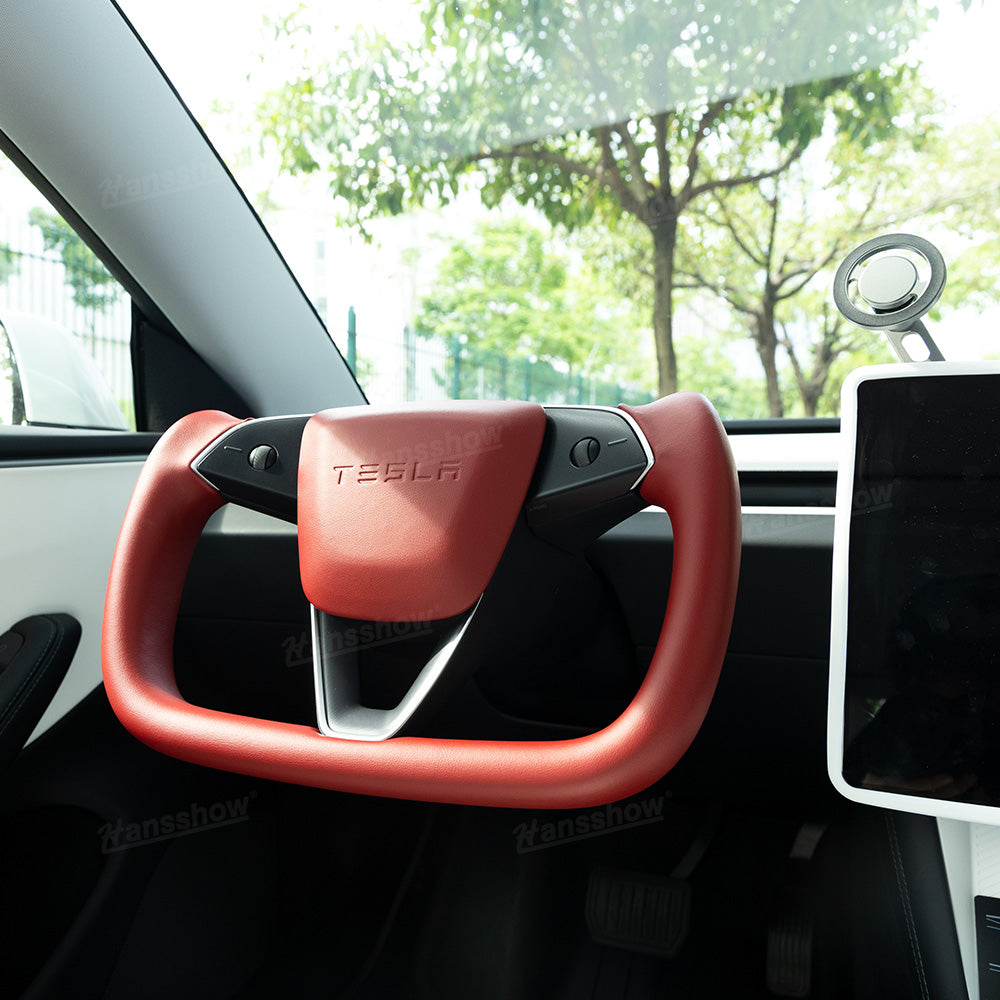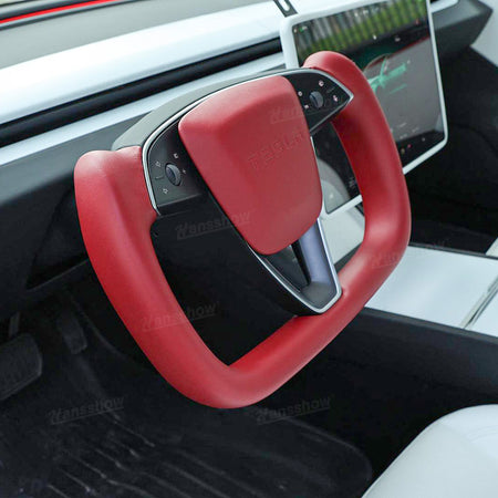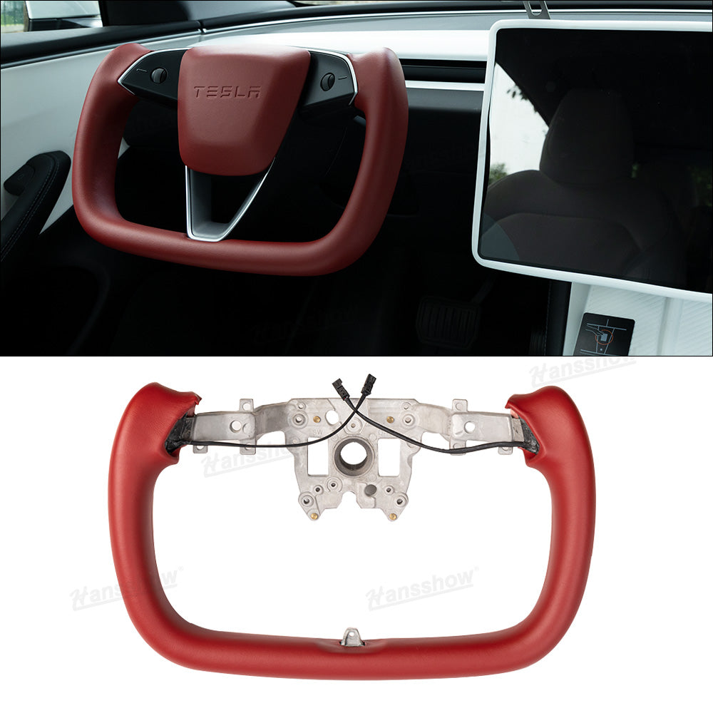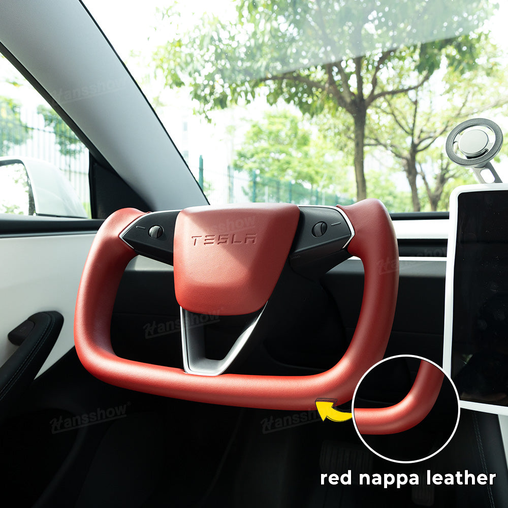 Model 3 Highland Yoke Steering Wheel with Full Red Nappa Leather for Tesla|Hansshow