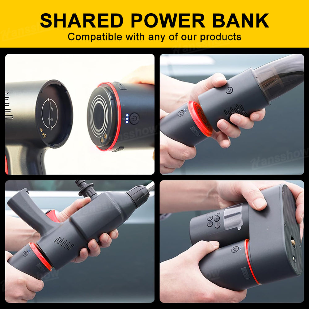 Note: The Tire Inflator, Pressure Washer, Vacuum Cleaner, and Phone Mount (Power Bank needed only for wireless charging) all require the Power Bank to operate.