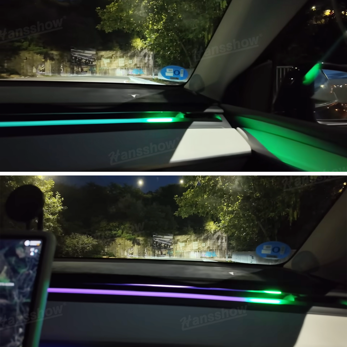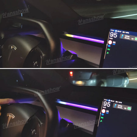 Tesla-Style Driving Display Lights: Engaging AP (Autopilot) mode triggers smooth, rainbow-colored light effects on both sides. Hansshow's ambient light is a sleek, modern way to visually signal that you’re in semi-autonomous driving mode.
