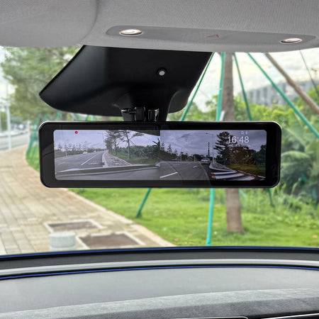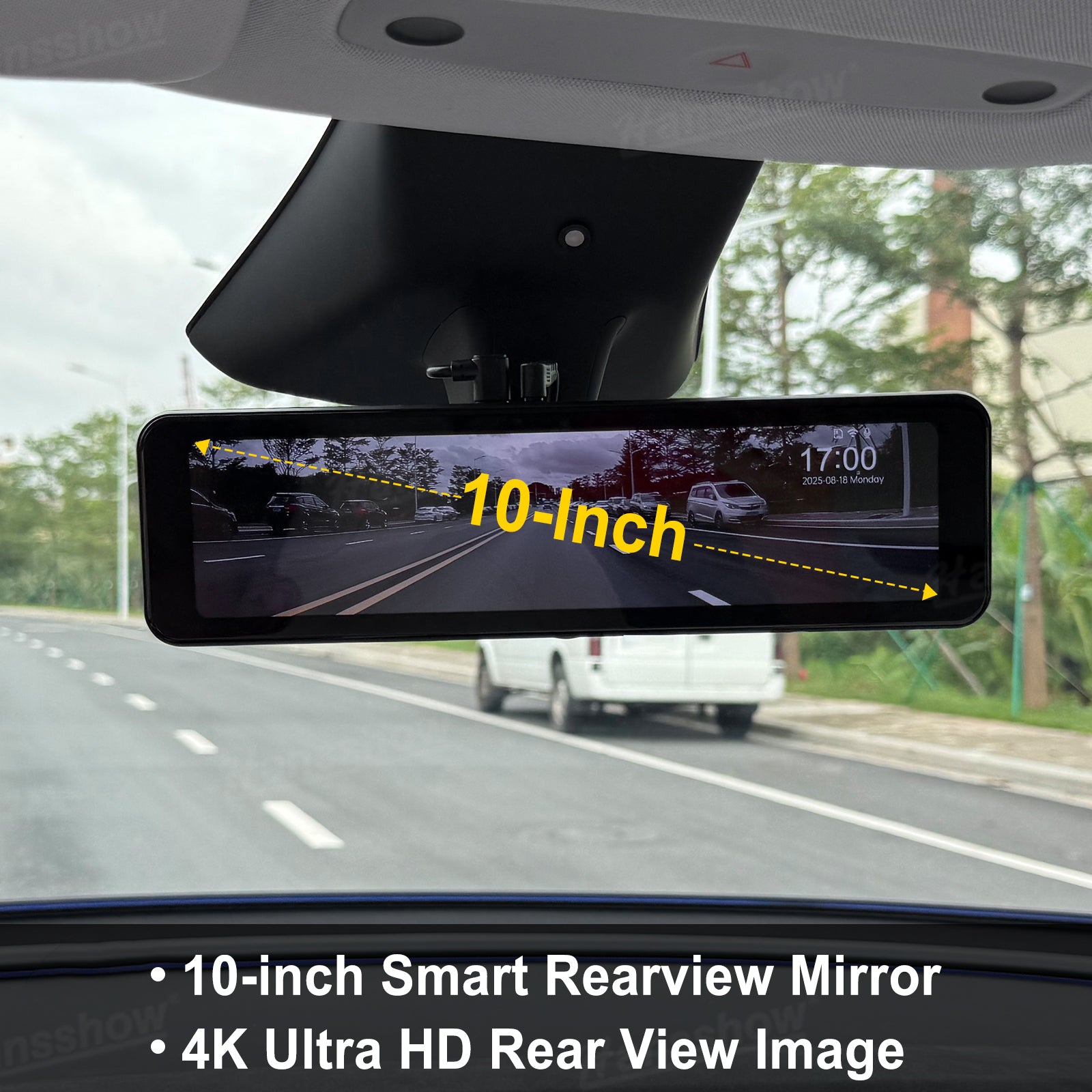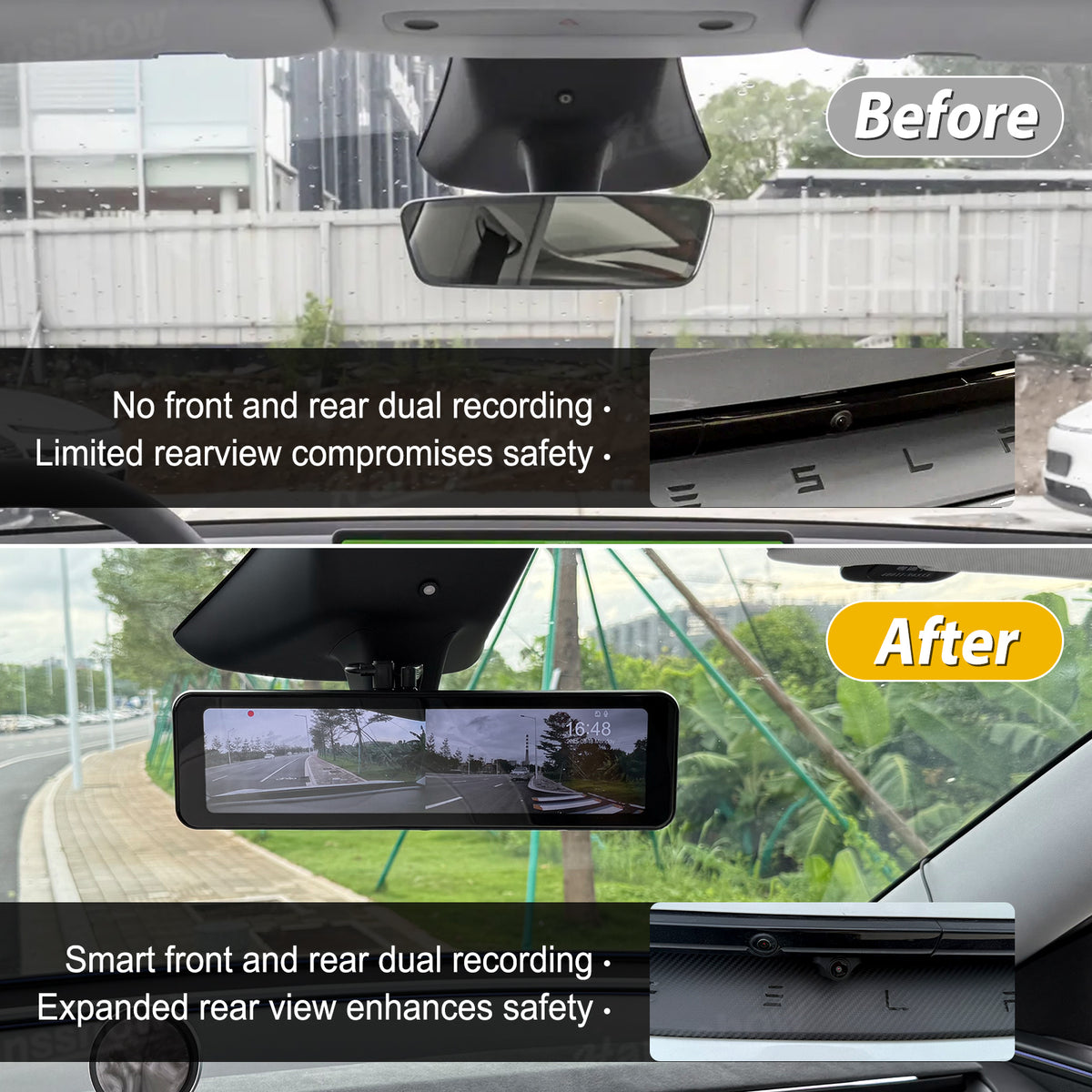 To solve this problem, Hansshow has developed an exclusive 10-inch media rearview mirror dash cam, tailor-made for the Model Y Juniper/3 Highland. The full-screen digital mirror enhances rear visibility and eliminates blind spots while offering a wider, clearer view compared to the factory mirror.