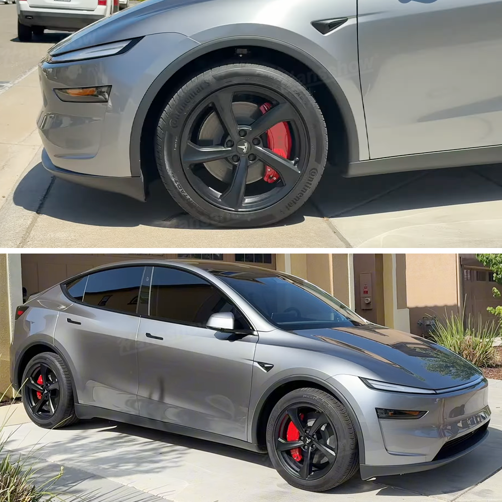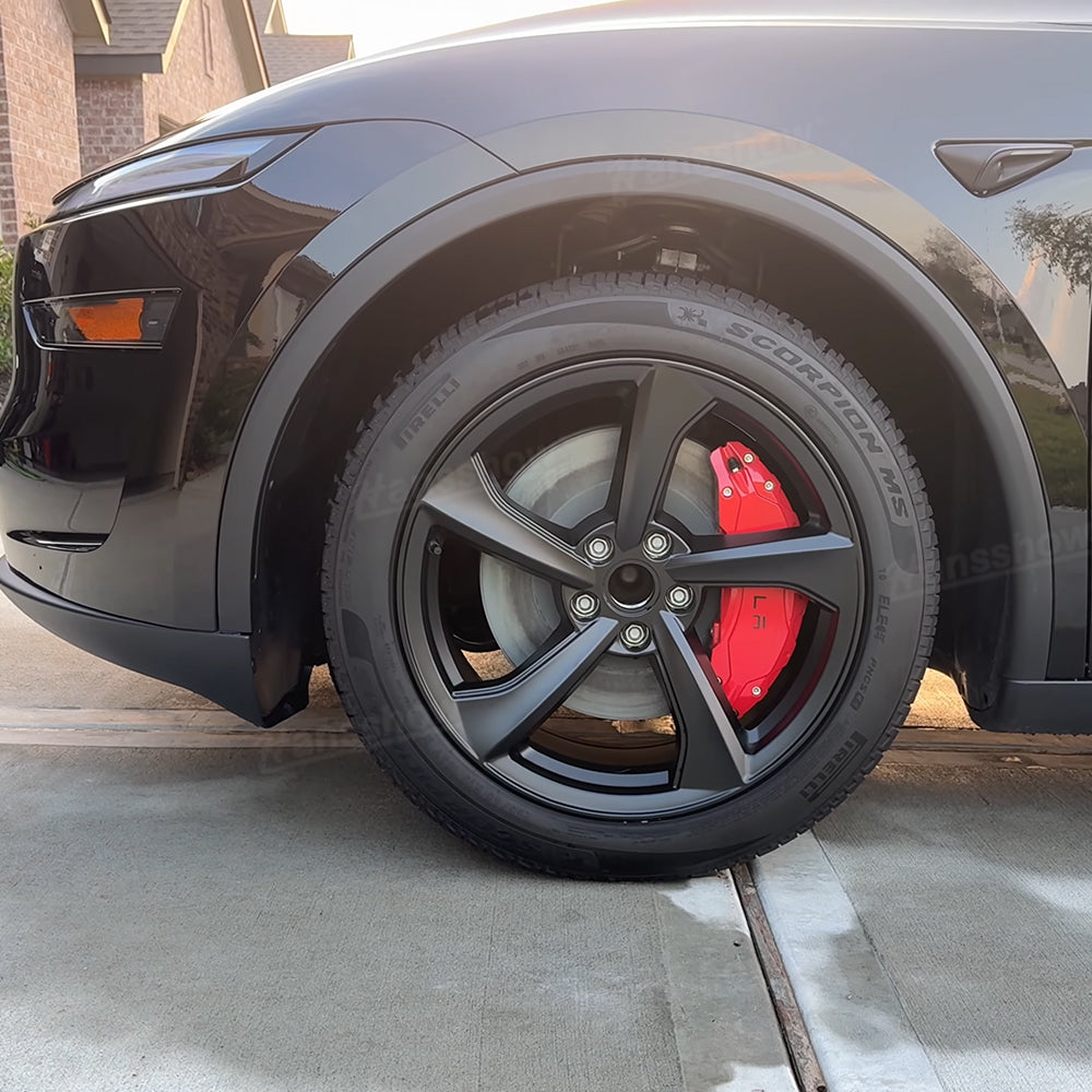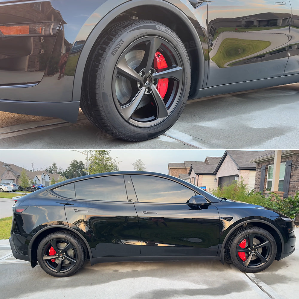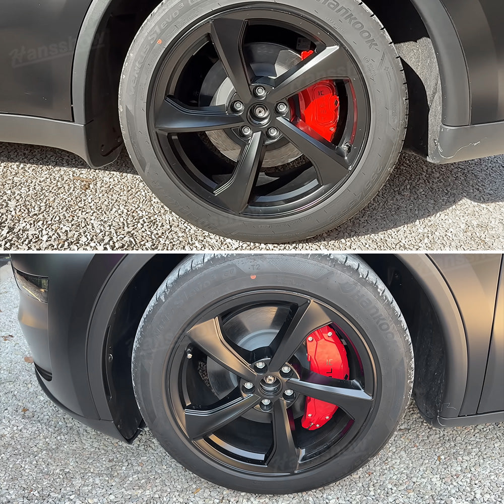 Installation is a breeze (10-15 minutes per wheel, DIY-friendly with included hex keys and decals), fully reversible, and warranty-safe. Heat-resistant aluminum alloy (up to 250°C curing) shrugs off daily abuse, rain, and road grime without fading or rattling, even on 19/20” wheels. No impact on braking—EVs rarely tax brakes anyway—and users rave about the premium feel and dust protection. It adds that sporty edge without mods, making your Juniper stand out effortlessly. 10/10—essential for style-savvy Tesla fans.
