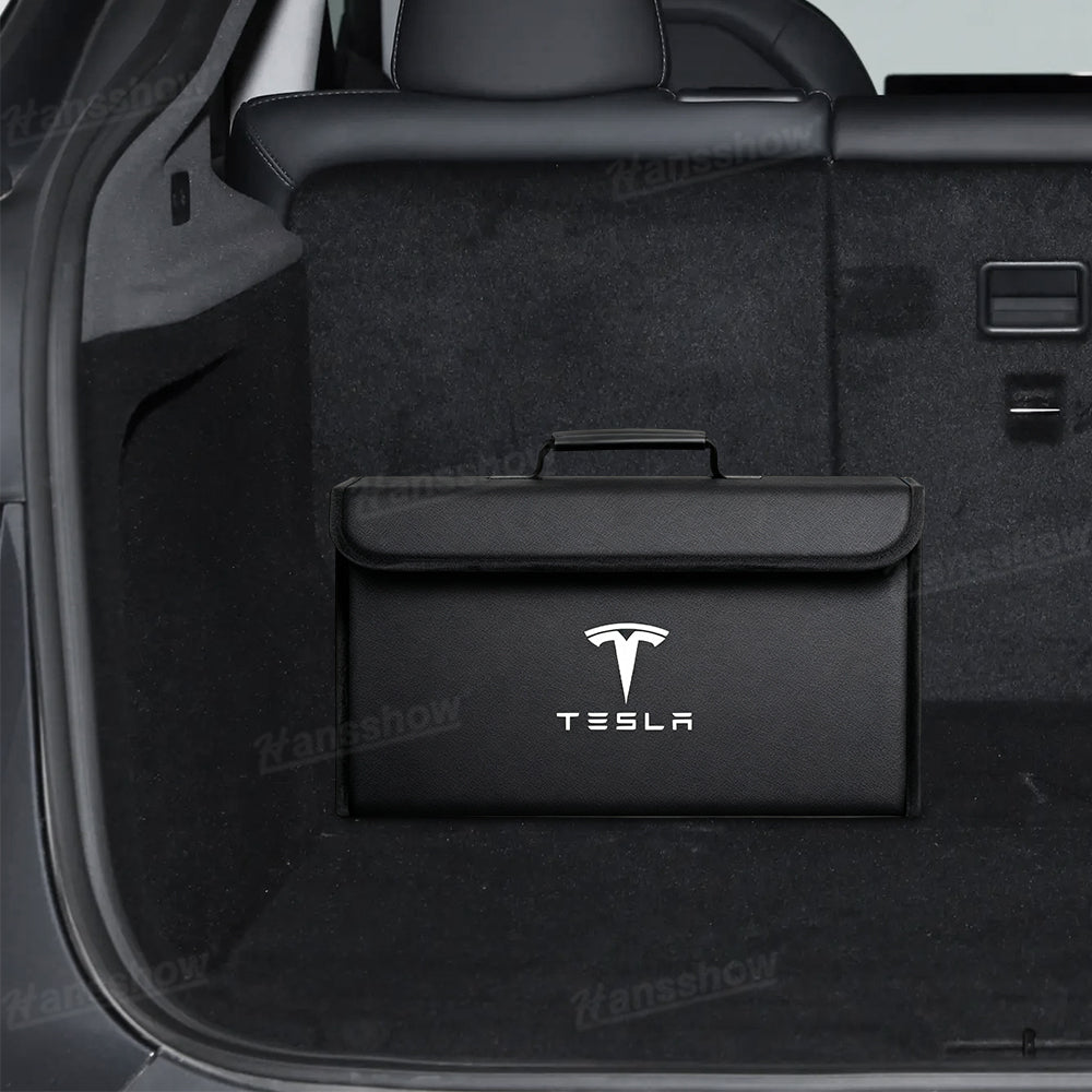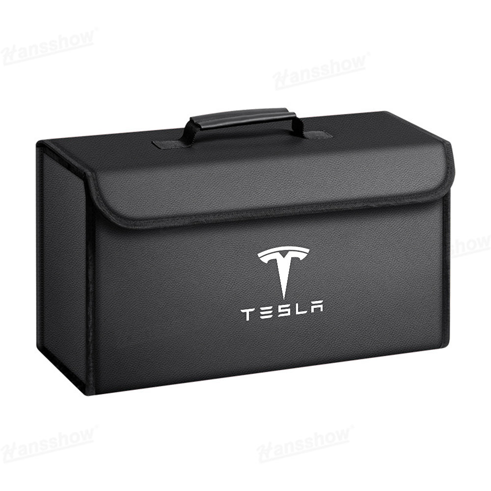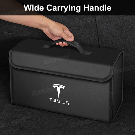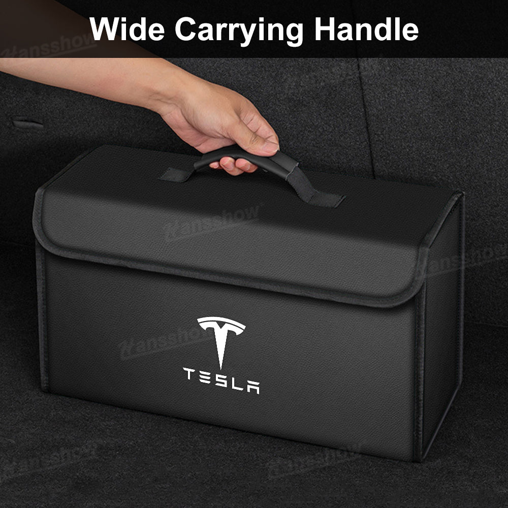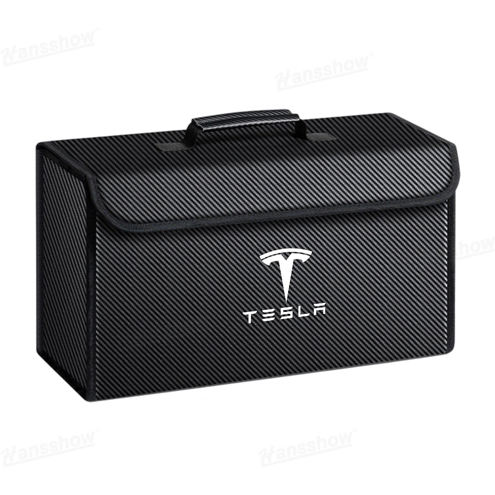 Premium Materials: Crafted from high-quality leather with a sleek carbon fiber texture or classic black finish, the Hansshow Foldable Trunk Organizer features the official Tesla logo for a stylish and authentic look.