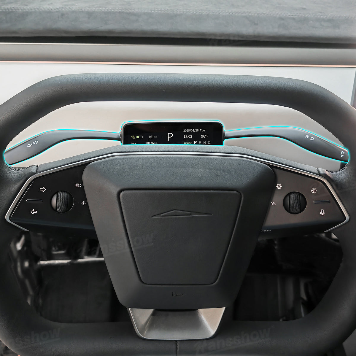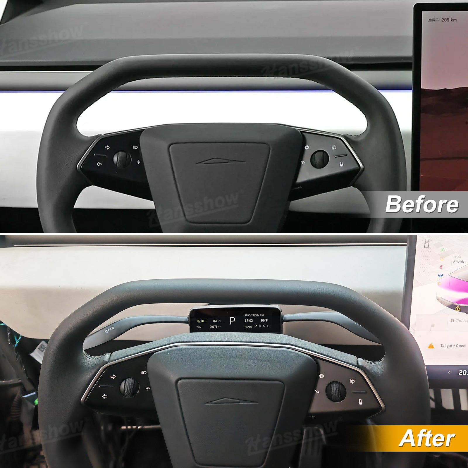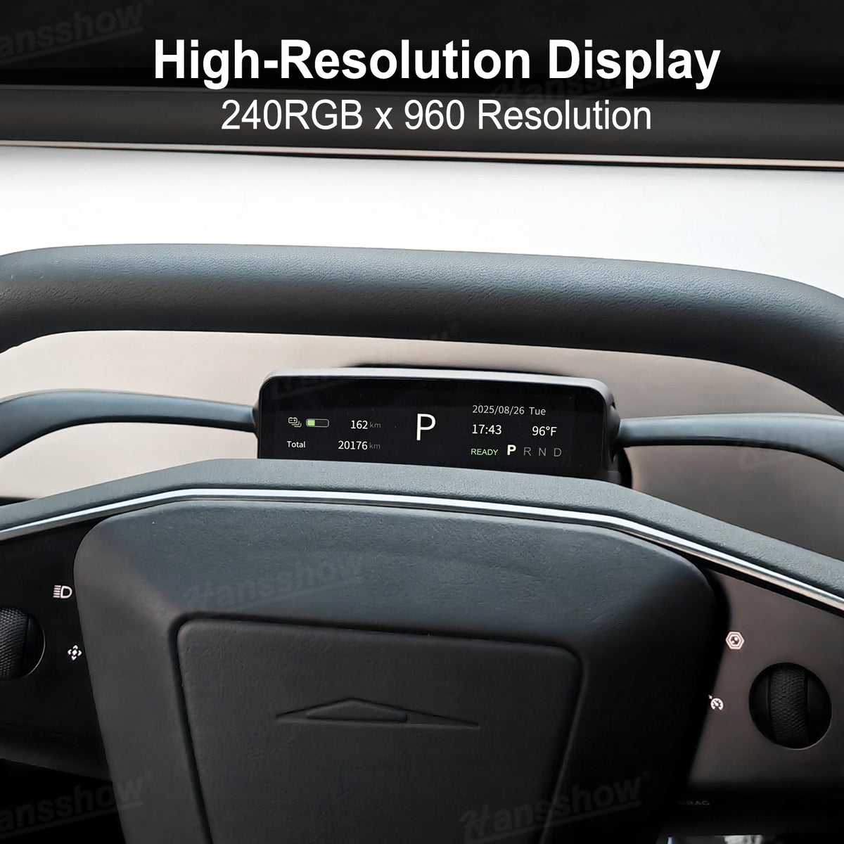 All-in-One Gear Shift and Display Design: Hansshow smart upgrade kit for Cybertruck integrates gear shift control stalks with a 3.71-inch LCD display in one seamless design. Effortlessly switch between Drive and Reverse while monitoring essential driving data like speed, range, and mileage—all in one compact, space-saving unit.