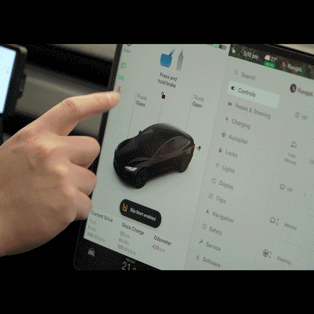 Solution: To open or close from the screen, press the brake pedal. For mobile app control, go to 'Home Controls,' then tap 'Open' on the vehicle model to activate