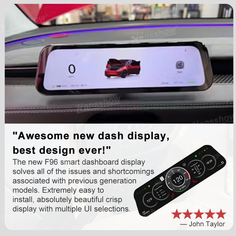 Smooth Performance with Octa-Core ARM Chip:Powered by an advanced ARM 8-core processor, Hansshow F96 head-up touch display handles multitasking like a pro. Run navigation, media, and vehicle data simultaneously without a hitch. Rigorously tested for Tesla compatibility, it integrates seamlessly with your OEM system—no bugs, no worries. Plus, OTA updates keep it in sync with Tesla software, so you're always up to date.