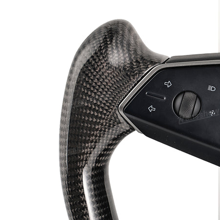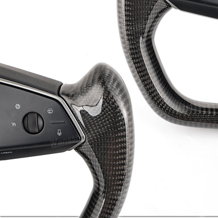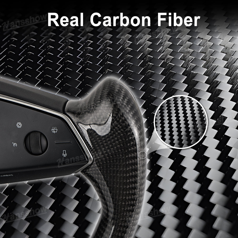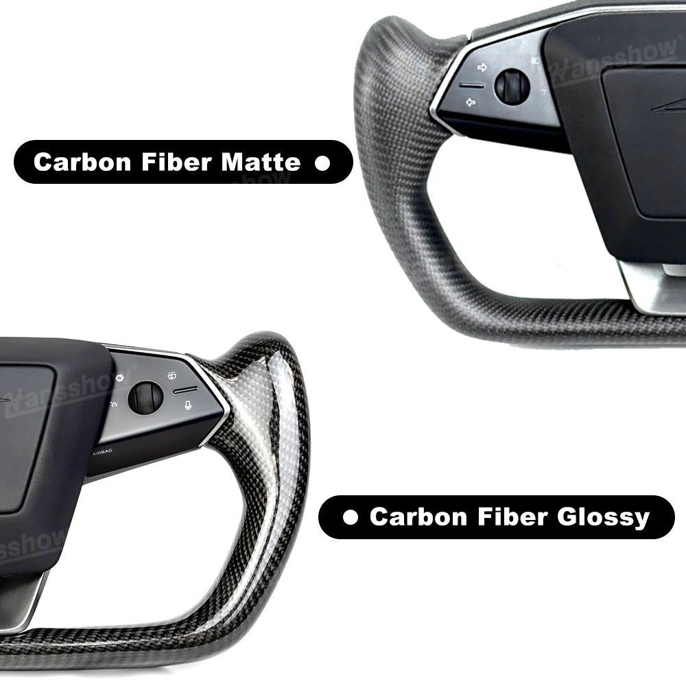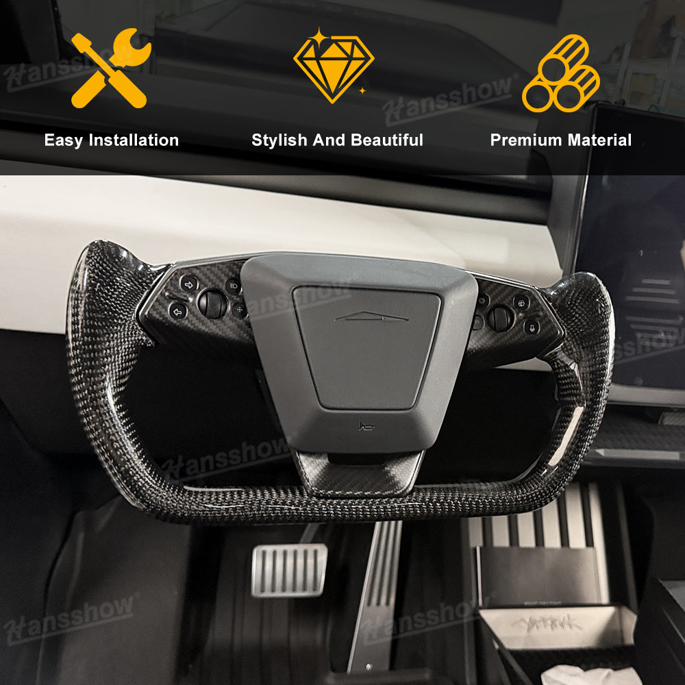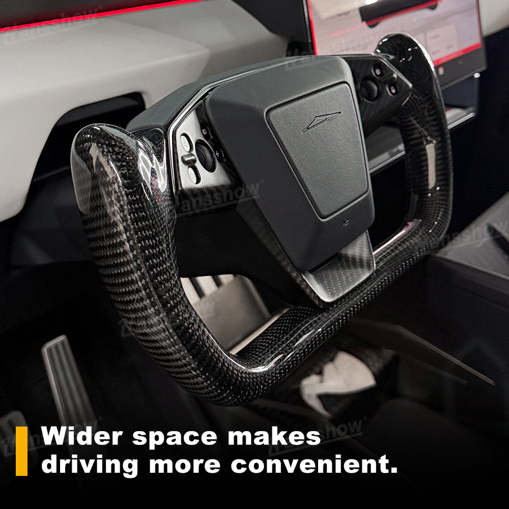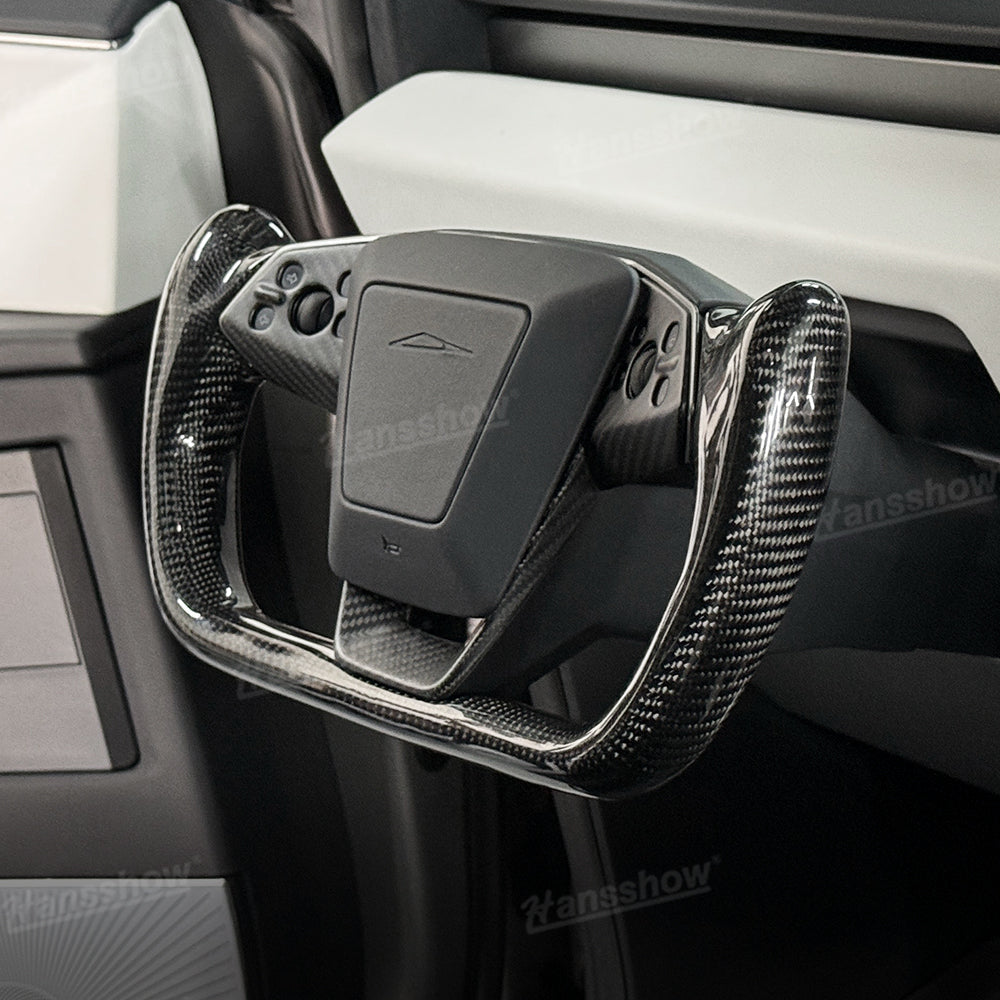 Carbon Fiber Yoke Steering Wheel: Crafted from hand-laid Real carbon fiber, Real carbon fiber better matches the Cybertruck's outdoor, off-road style.
