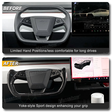 New Yoke More responsive with hand movements: Cybertruck steering wheel has Limited Hand Positions/less comfortable for long drive,We modify an original TESLA Factory Cybertruck steering wheel to deliver a yoke specifically designed for steer-by-wire technology. Steer-by-wire offers a significant advantage for your Cybertruck by providing a reduced steering ratio compared to the Model S and X, which require multiple rotations to make sharp turns. With Hansshow Cybertruck Yoke, all it takes is a simple left or right hand movement to steer—no more full rotations!