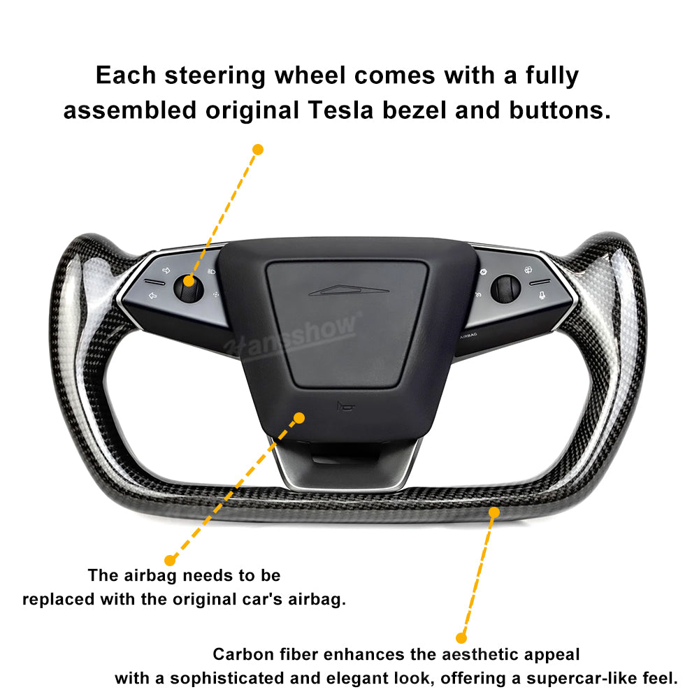 Tesla-Compatible Steering Wheel: Designed to match Tesla’s factory standards, ensuring reliable quality and seamless integration with your Cybertruck. Our yoke steering wheel is engineered for performance and comfort, while maintaining full compatibility with your vehicle’s OEM features.