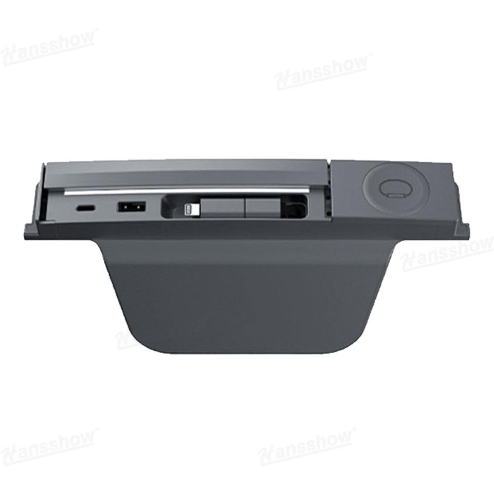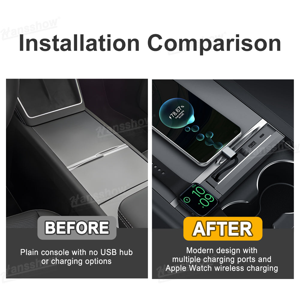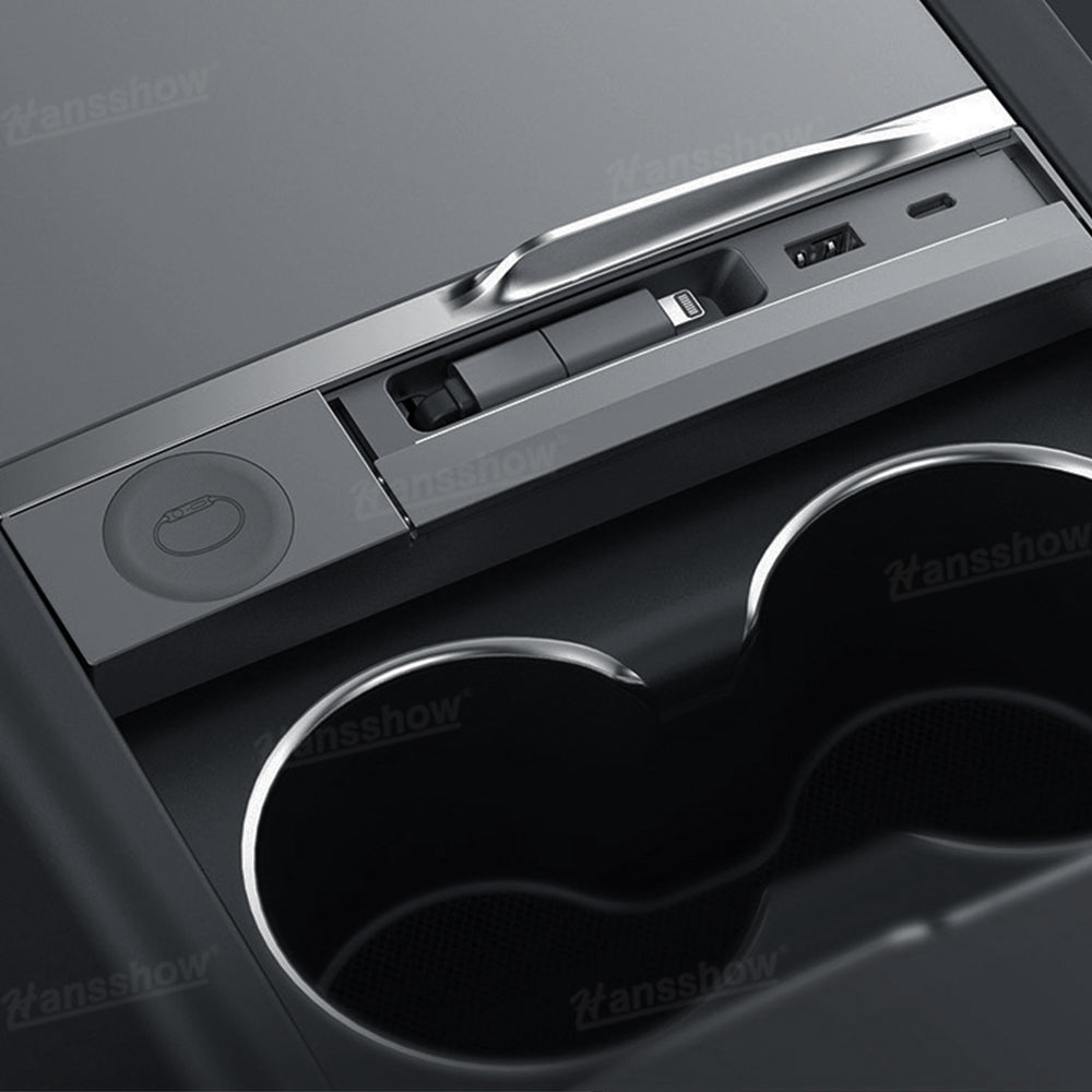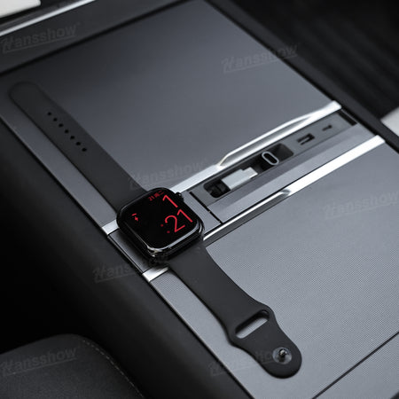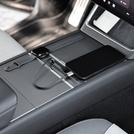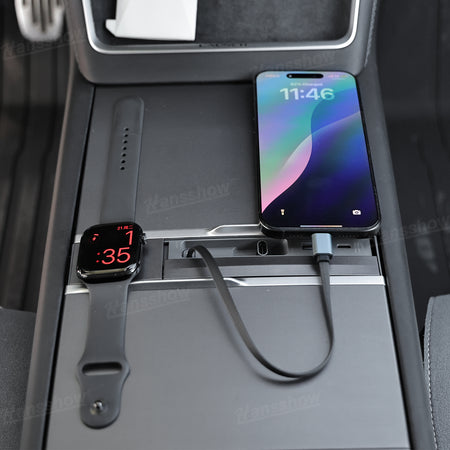 Transform your Model 3 Highland or Model Y Juniper console into a clean, organized charging hub. The Hansshow USB HUB Adapter combines Apple Watch charging, dual-device connectivity, and a smooth sliding cover into one seamless module that feels like original Tesla equipment. Everything sits flush, stays protected, and keeps your cabin looking modern and clutter free.