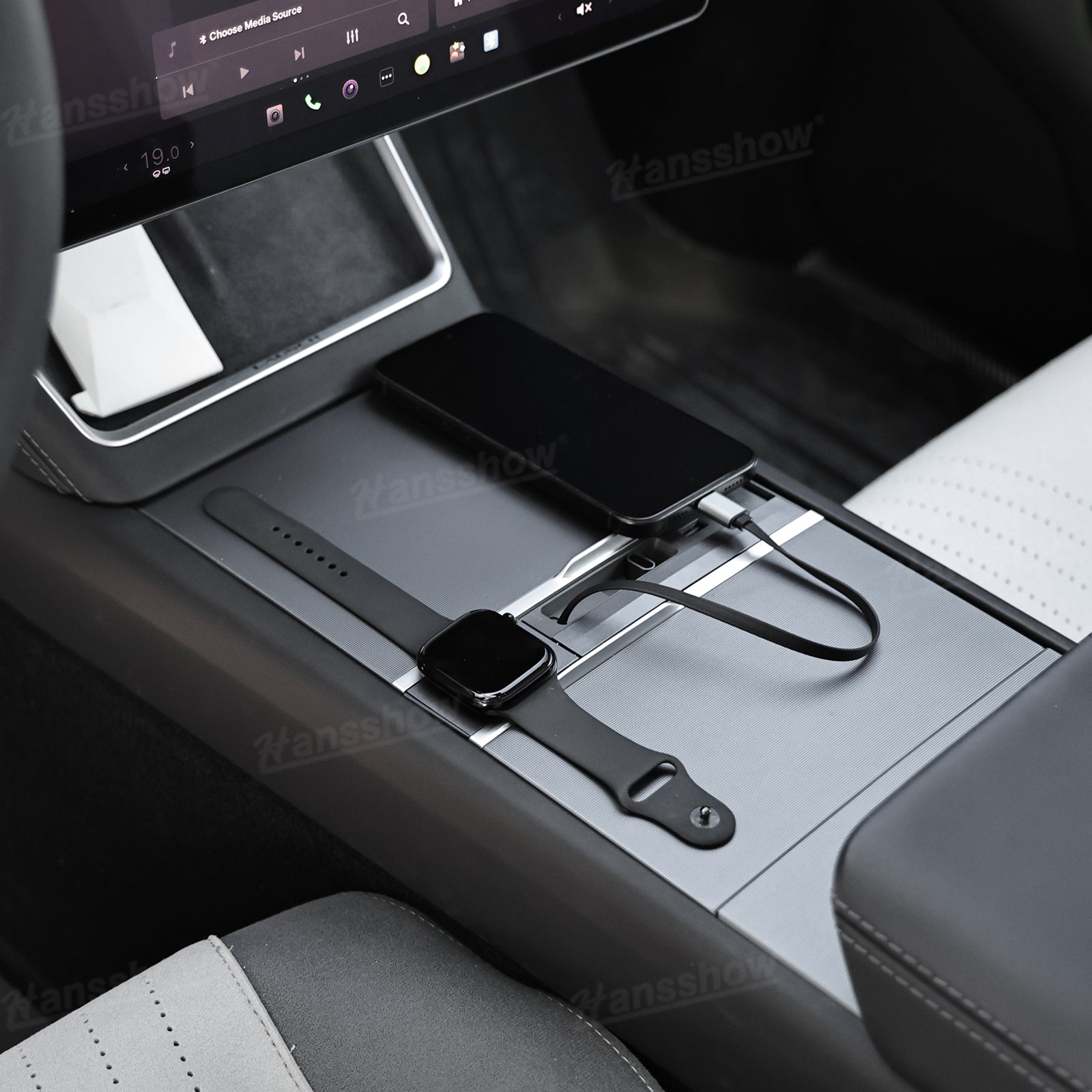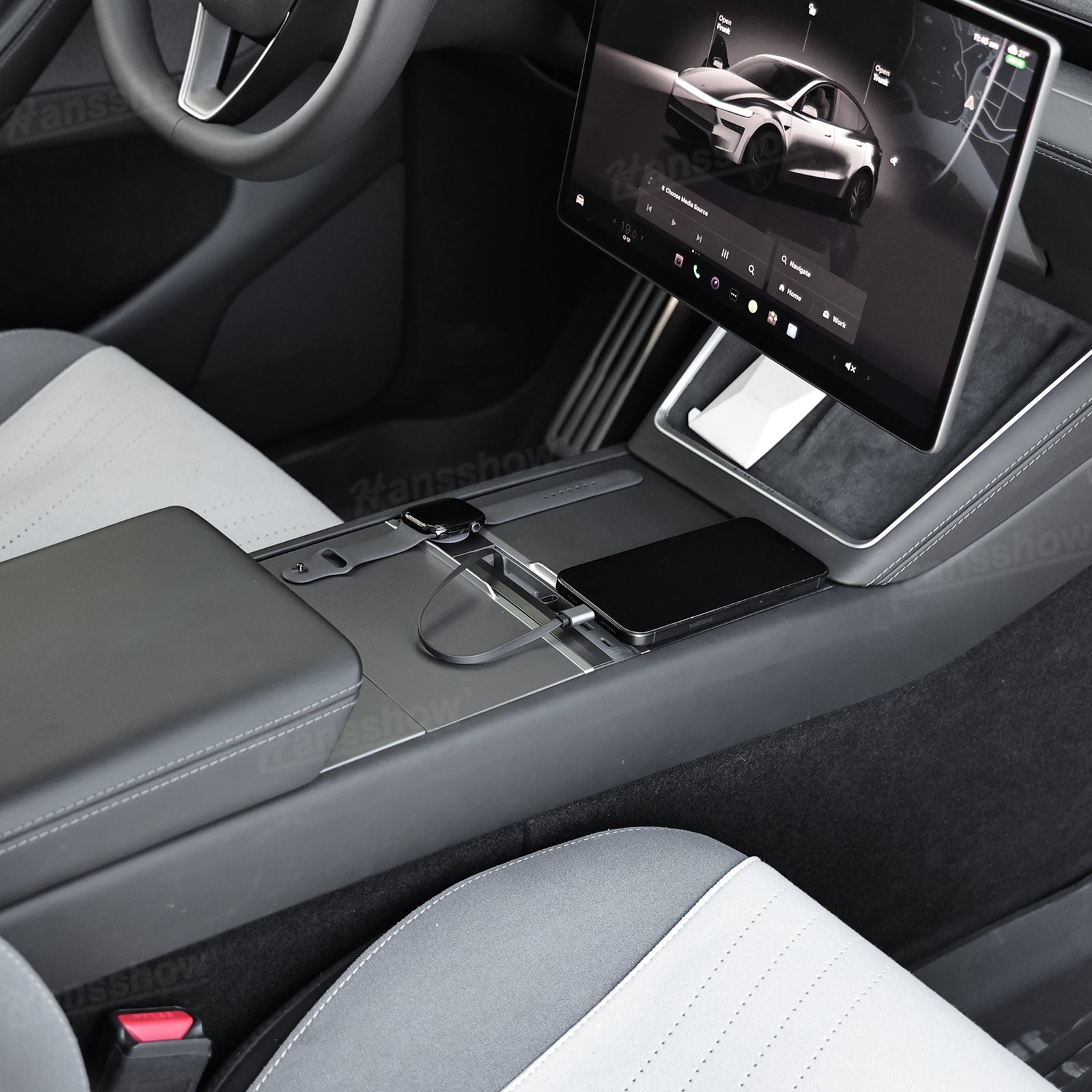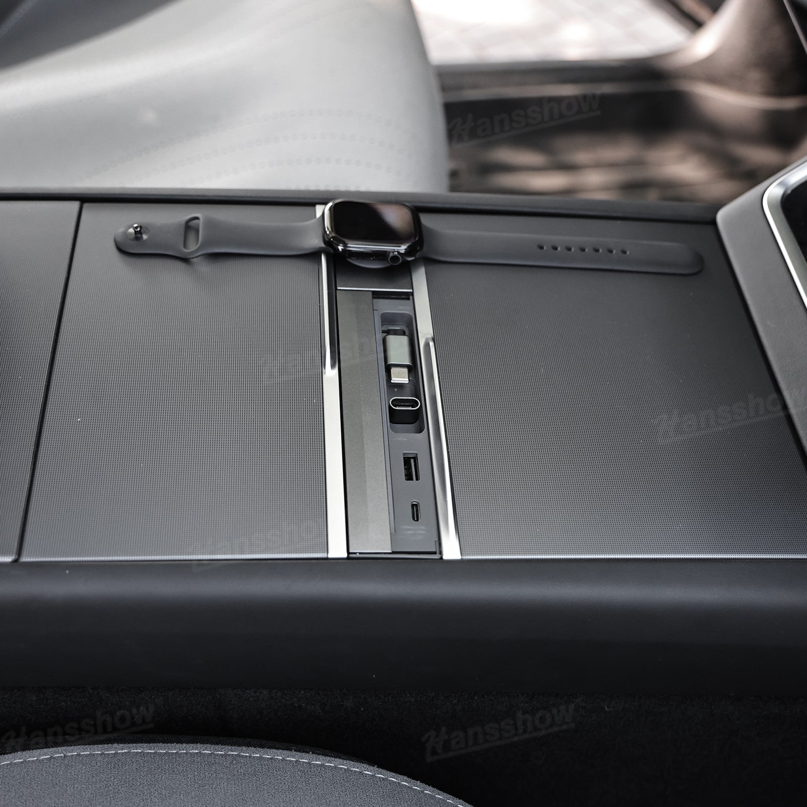 Transform your Model 3 Highland or Model Y Juniper console into a clean, organized charging hub. The Hansshow USB HUB Adapter combines Apple Watch charging, dual-device connectivity, and a smooth sliding cover into one seamless module that feels like original Tesla equipment. Everything sits flush, stays protected, and keeps your cabin looking modern and clutter free.