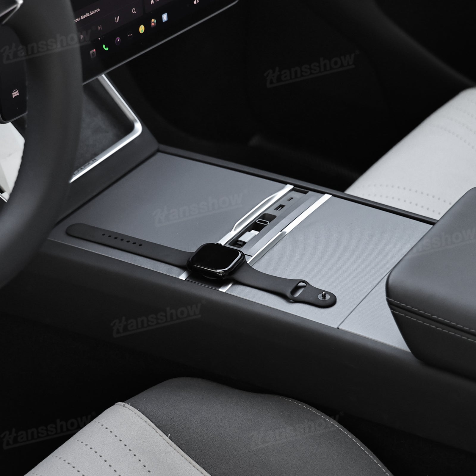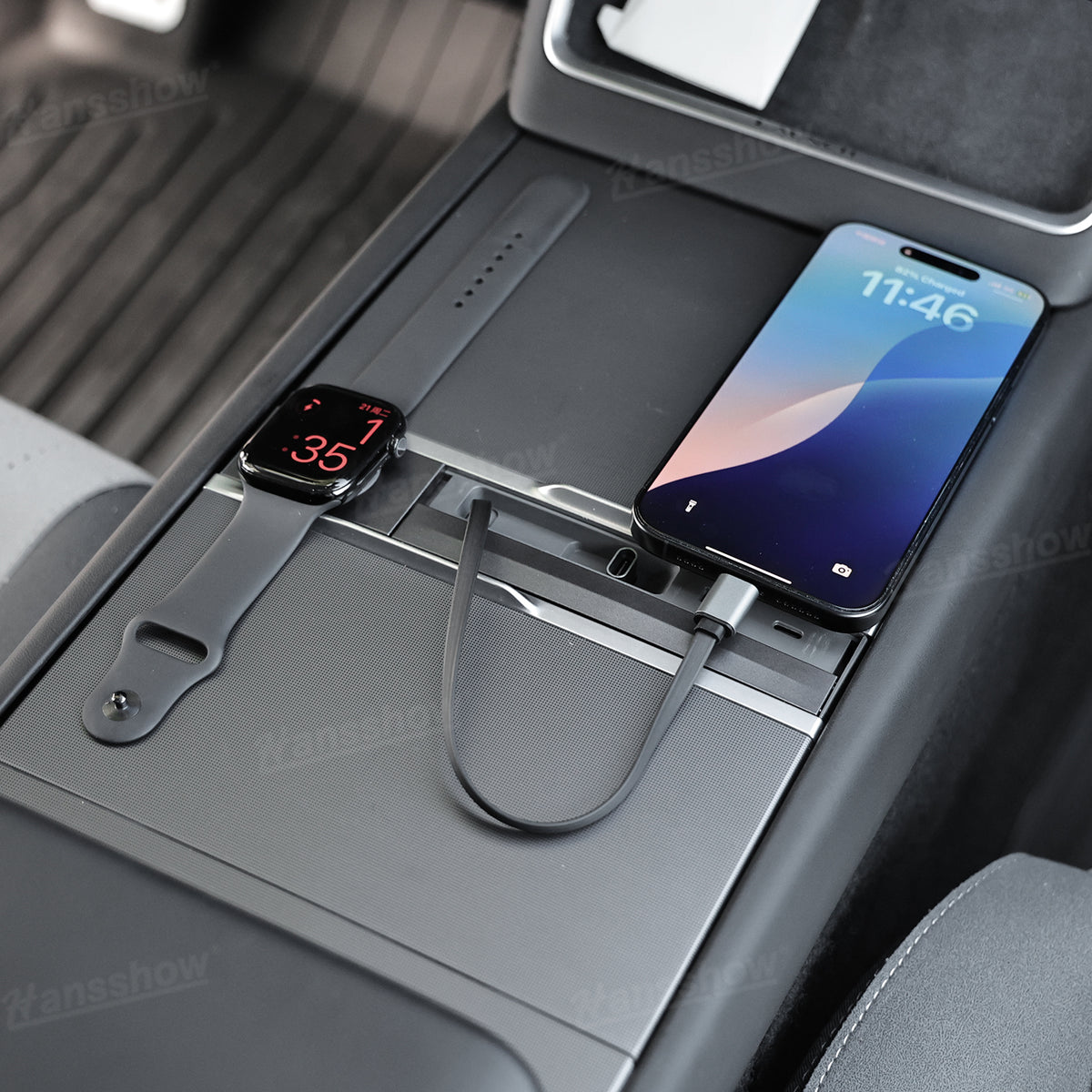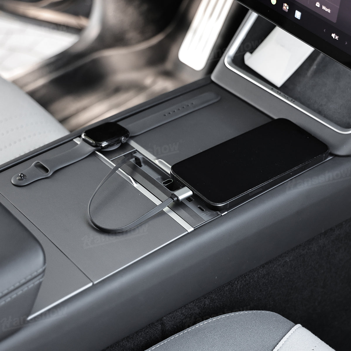 Built-in Apple Watch Wireless Charging: No more searching for extra cables. The integrated Apple Watch magnetic charger keeps your watch powered while you drive. The charging pad sits securely inside the console for a clean and convenient setup.