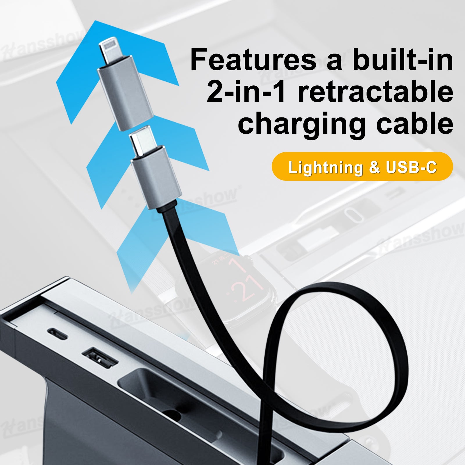 2-in-1 Retractable Charging Cable: Stay organized and charge more devices. The built-in retractable cable features dual connectors with Lightning for Apple devices and USB-C for Android devices. It extends smoothly and retracts neatly to eliminate wire mess inside the console.