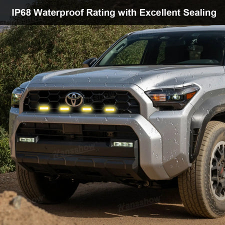 IP68 Waterproof Sealed Design: Hansshow grille lights are built with tightly sealed housings and carry an IP68 waterproof rating, making them highly resistant to rain, snow, and mud. The sealed design helps prevent moisture buildup and reduces the chance of fogging, ensuring dependable visibility in most weather conditions.