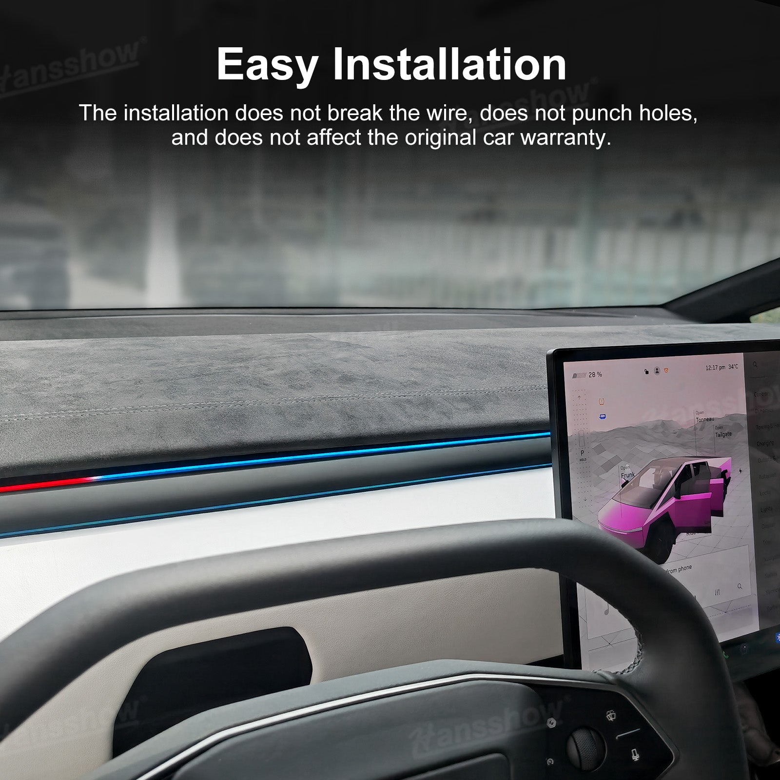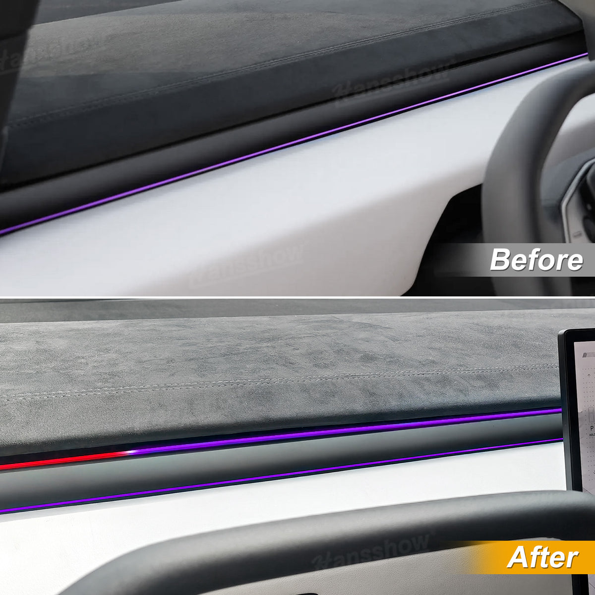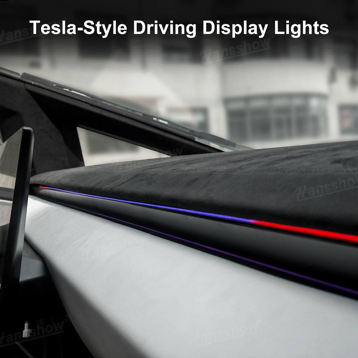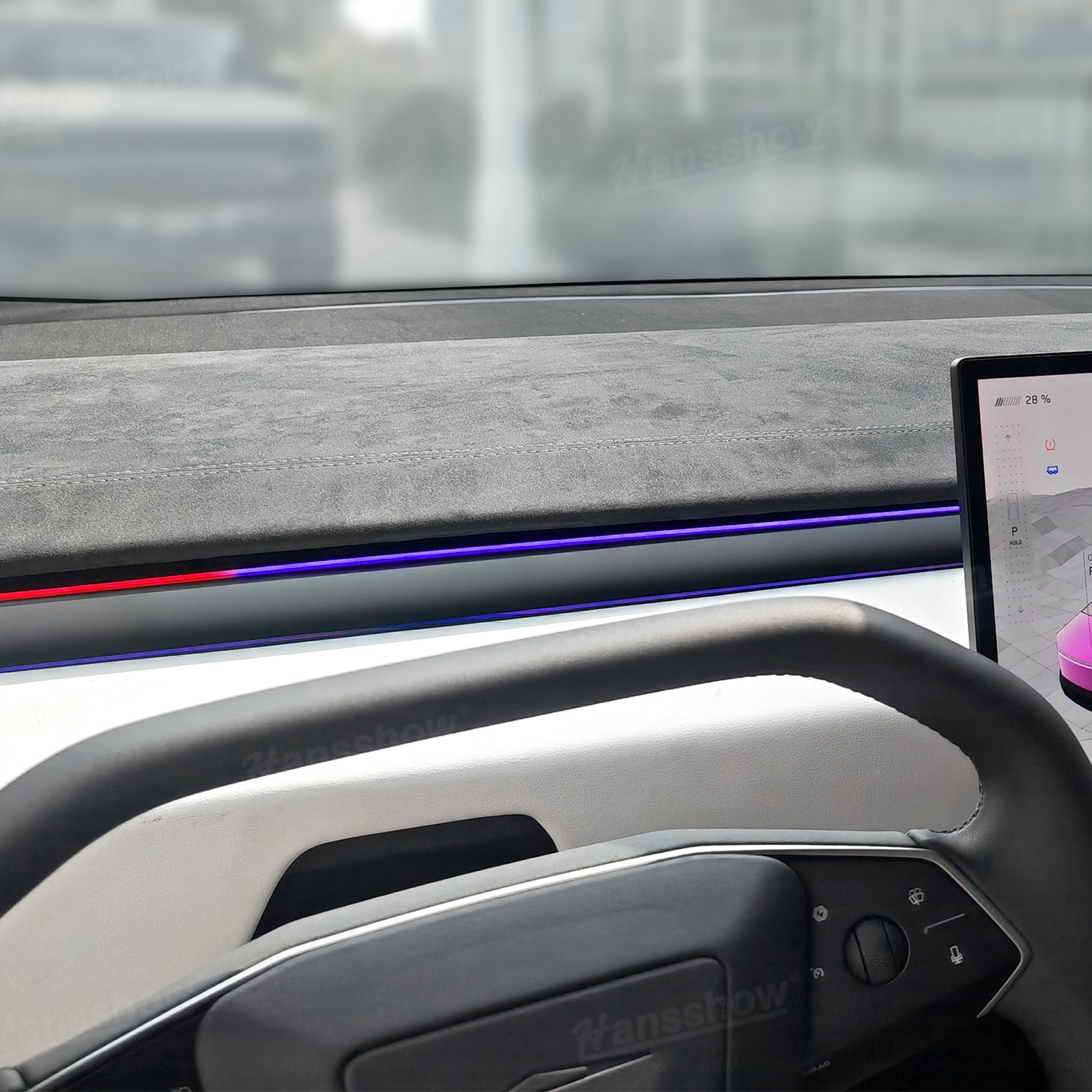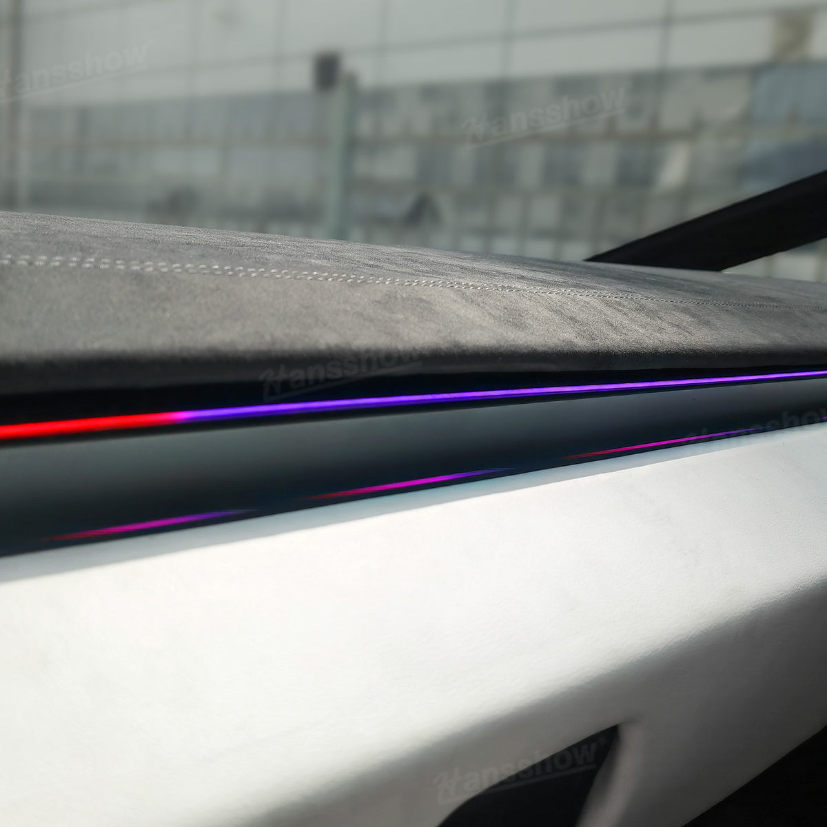 The Hansshow streamer ambient lighting system's colors blend perfectly with the factory ambient lighting and can be controlled via the factory central touchscreen. It also features an intelligent blind spot warning system, adding a unique ambiance to your journey while protecting your safety.