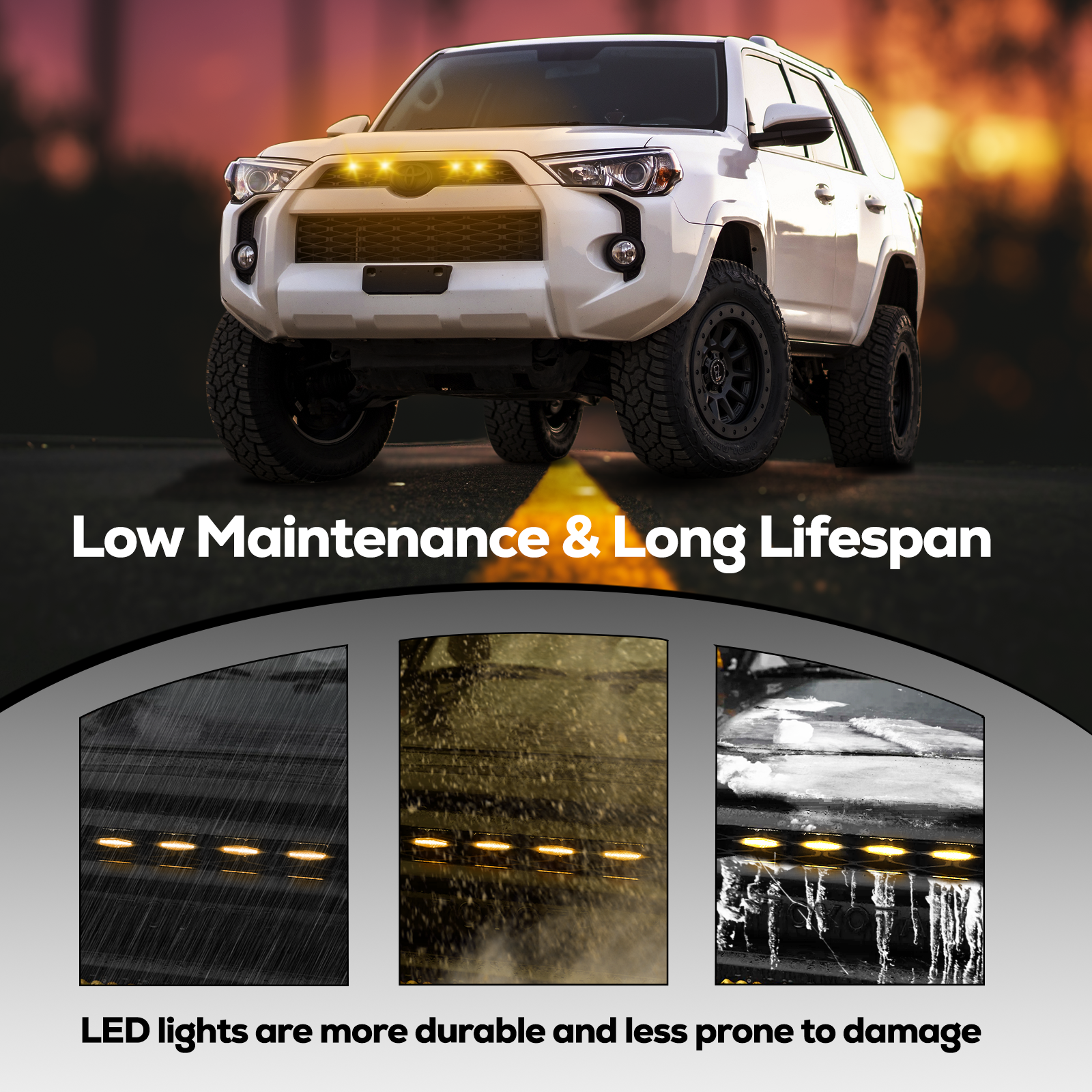 Tough, Weatherproof Build for All Conditions: Constructed with high-quality ABS and polycarbonate materials, 4Runner LED grille light is built to handle whatever the road—or trail—throws your way. With excellent waterproofing and rugged durability, it resists rain, mud, UV rays, and daily wear without breaking a sweat.