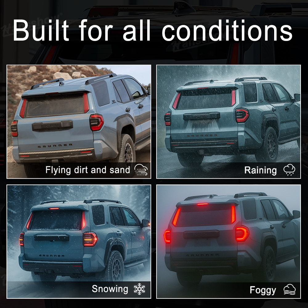 Multi-Function Lighting System: Rear trunk pillar tail lights combine running lights, brake lights, and sequential turn signals for enhanced safety and utility. When you start the vehicle, the lights perform a flowing animation before settling into the daytime running light mode—this upgrade gives your 4Runner a more dynamic, modern look from the rear.