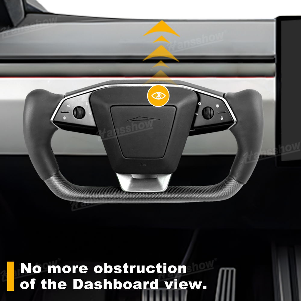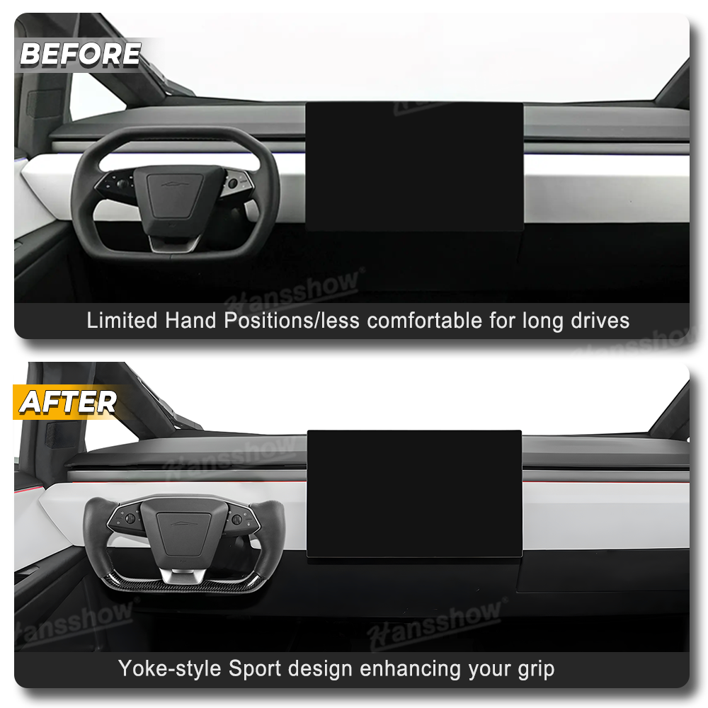 New Yoke More responsive with hand movements: Cybertruck steering wheel has Limited Hand Positions/less comfortable for long drive,We modify an original TESLA Factory Cybertruck steering wheel to deliver a yoke specifically designed for steer-by-wire technology. Steer-by-wire offers a significant advantage for your Cybertruck by providing a reduced steering ratio compared to the Model S and X, which require multiple rotations to make sharp turns. With Hansshow Cybertruck Yoke, all it takes is a simple left or right hand movement to steer—no more full rotations!