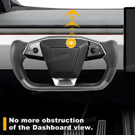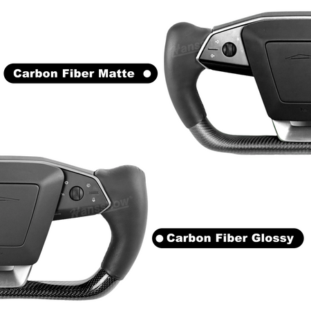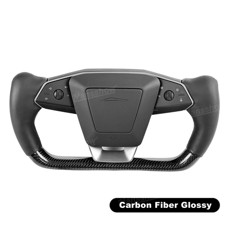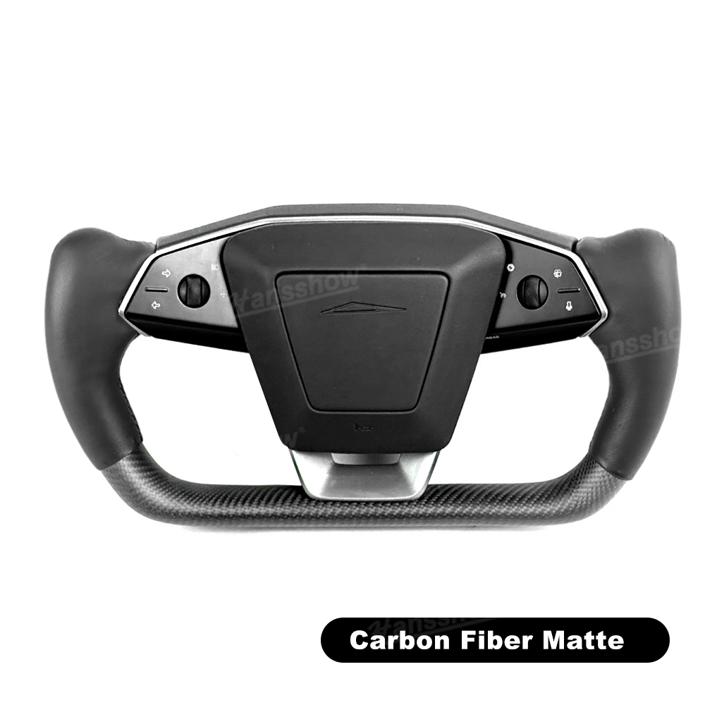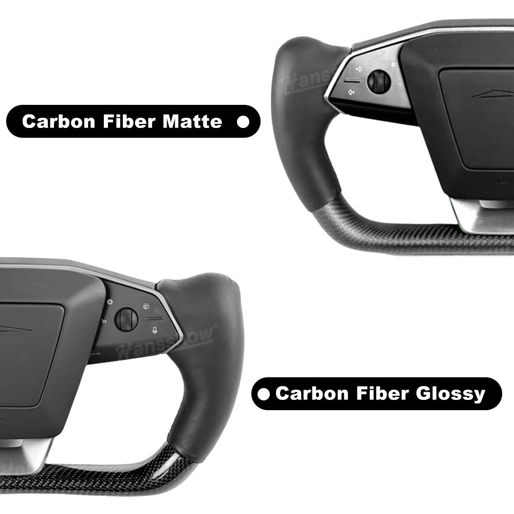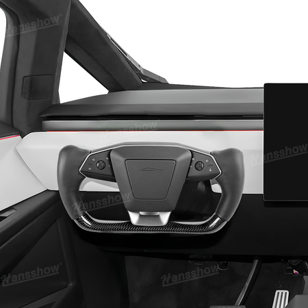 lower half features Carbon Fiber Yoke Steering Wheel: Crafted from hand-laid Real carbon fiber, Real carbon fiber better matches the Cybertruck's outdoor, off-road style.