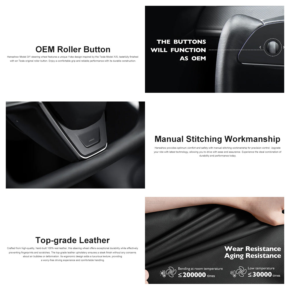 • Sleek & Sporty Design:  Hansshow new style yoke steering wheel design that is inspired by OEM Tesla Model S/X Yoke steering wheel, adopt sleek and sporty design to elevate the Model 3/Y interior aesthetics. This steering wheel is not made using original factory fake leather, but it's sturdier and more durable to wear and tear. Its ergonomic design adds a luxurious texture, providing a comfortable driving experience and improved grip for handling.