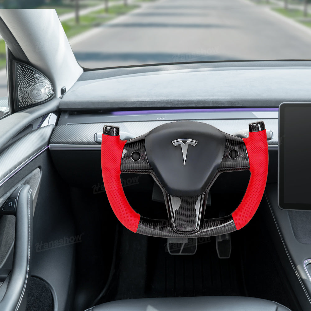 High-quality material: Crafted from a high-quality carbon fiber material, known for its strength and lightweight properties. Equipped with breathable perforated leather wraps on each side, this steering wheel offers exceptional durability while effectively preventing fingerprints and scratches.