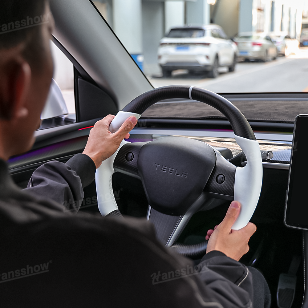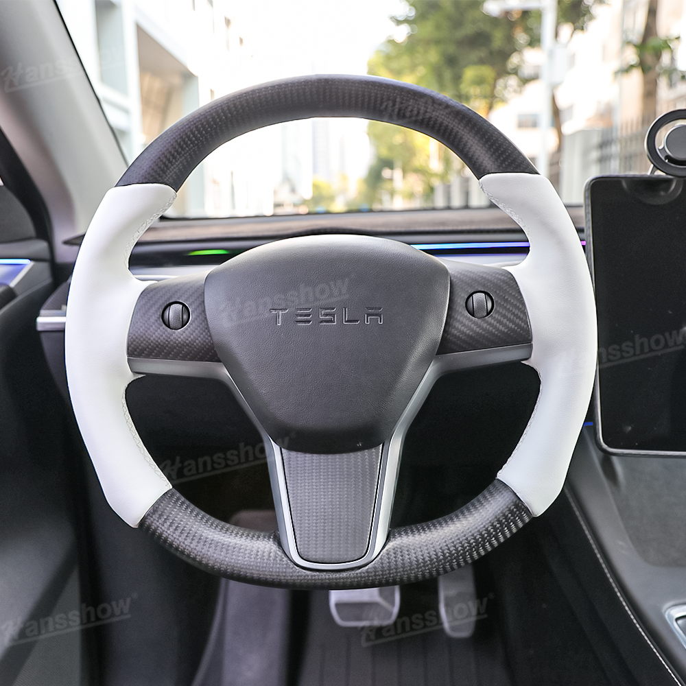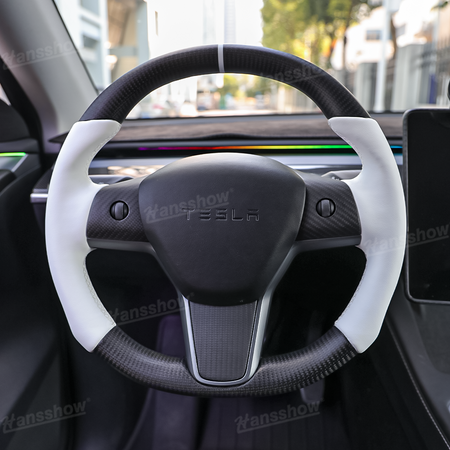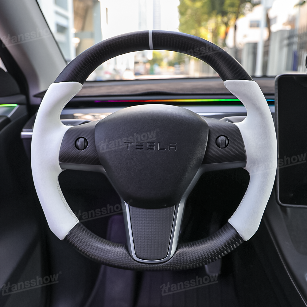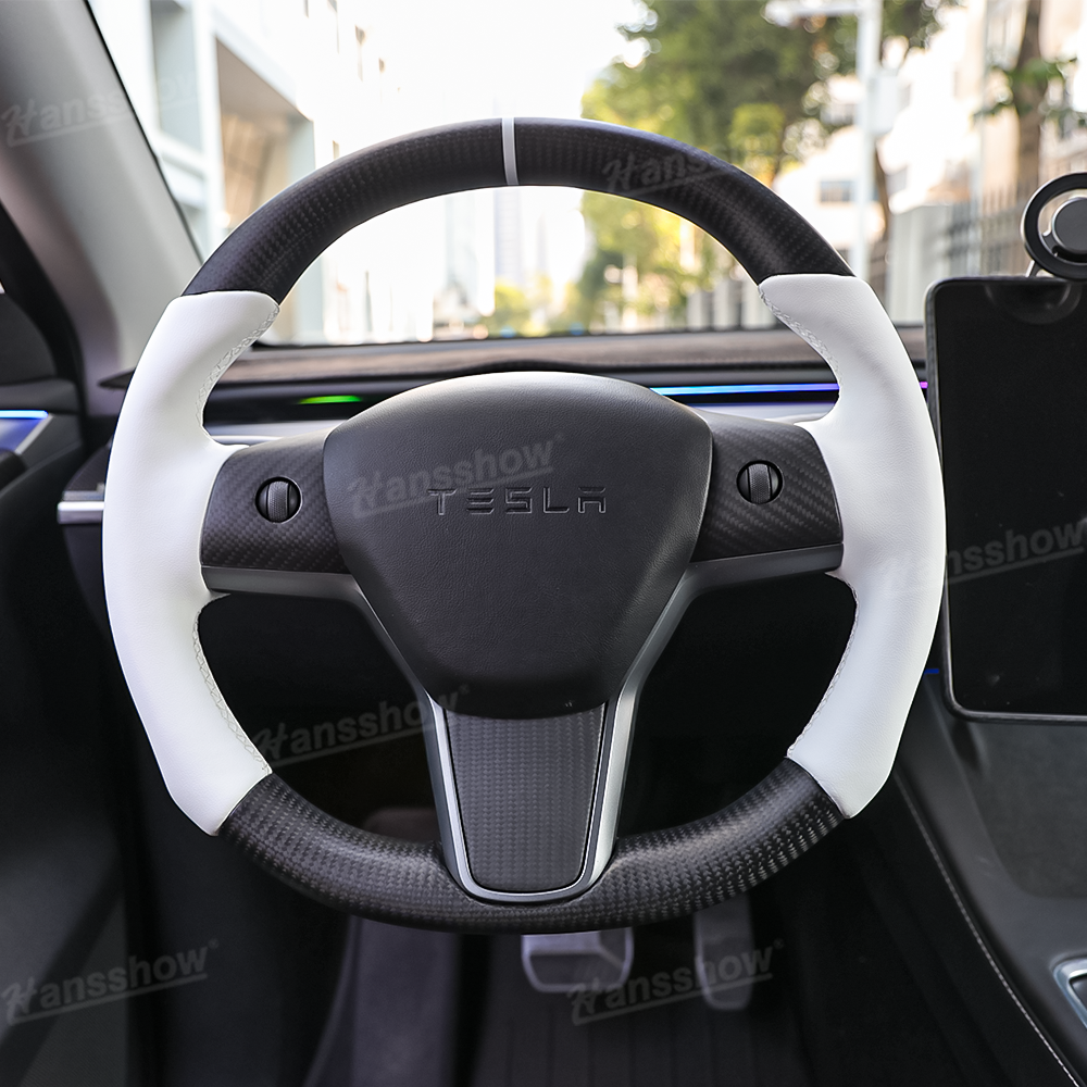 Tesla Model Y/3 Real Carbon Fiber Round Steering Wheel White Nappa Leather Handgrip|Hansshow